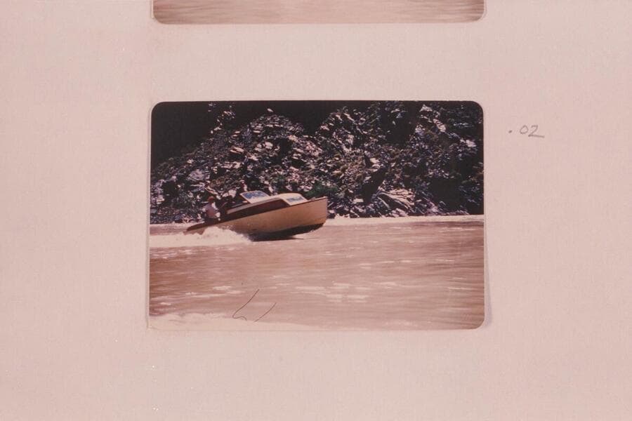 One of the Wright-Rigg Chris-Craft Kit Boats in Soap Creek Rapid. Copy of print in album of Rosalind Johnson