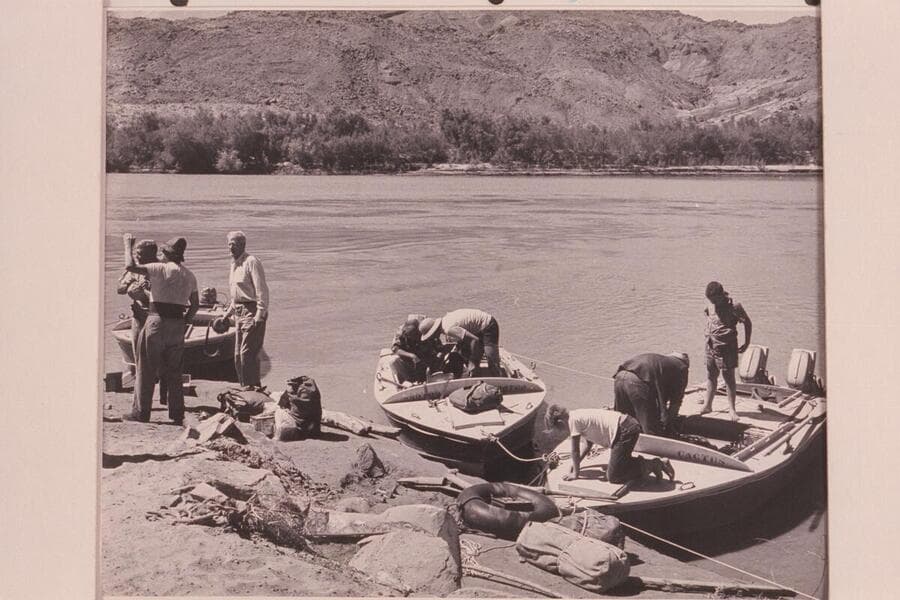 Crew preparing for departure from Lees Ferry: Sanderson; Taylor; Desloge; Visbak; Cutler; Jim Jordan; Belknap; Buzz Belknap
