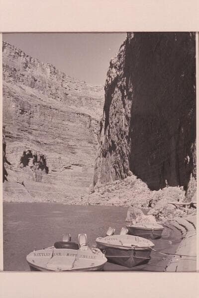 Boats and motors arriving at Lees Ferry for the start of the Marble-Grand Canyon traverse of 1954, June