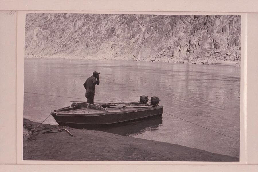 Rod Sanderson in the "Rattlesnake" used in the 1954, June Grand Canyon traverse. The boats were of aluminum and 18 feet long with 6 feet of beam. Power was from two 15HP Evinrude motors