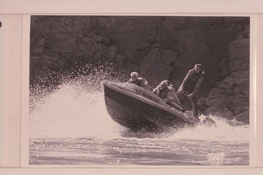 The "Rattlesnake" in Mile 217 Rapid, Grand Canyon. Joe Desloge is at the left, Rod Sanderson is the pilot and Hugh Cutler is in back of him. Argwen Bundy stands on the after deck bracing against a rope bridle