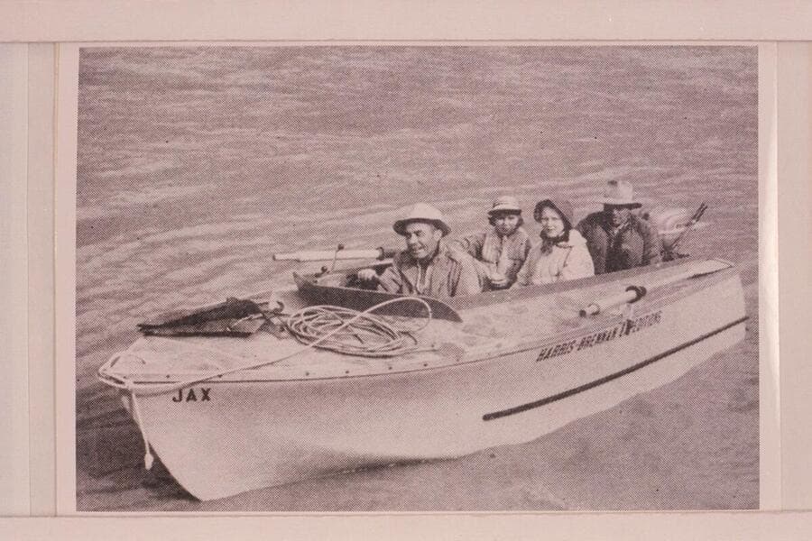 "JAX", the wizard hull owned by Jack Brennan and used on the Yampa and Green River in 1954. In the boat: Jack Brennan, Georgiana, Rena and Dr. Leslie White