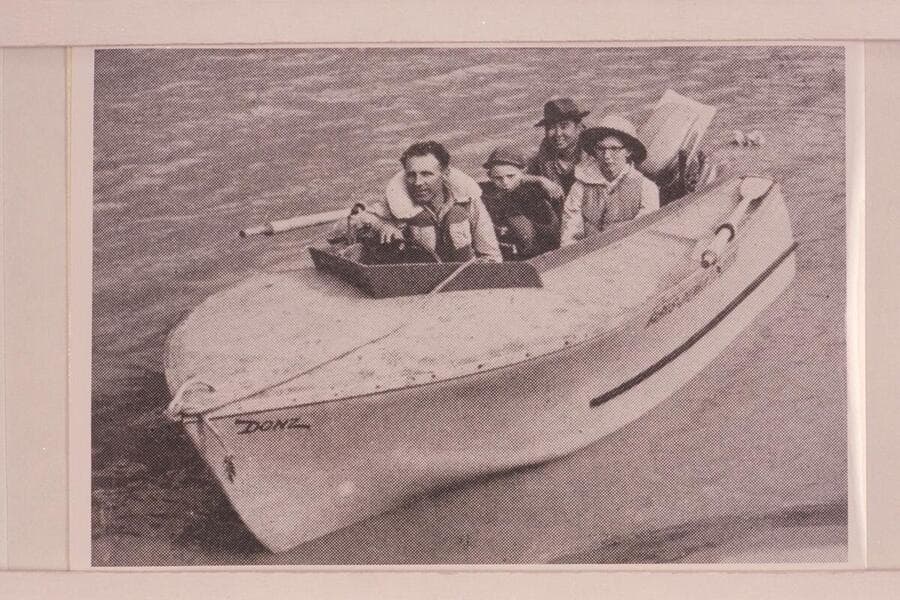 "DONZ", the wizard hull powered with outboard motor used by Don Harris on the Yampa and upper Green Rivers in 1954. In the boat: Don Harris, Barry White, Harry Ishimatsu and Mary Lou White