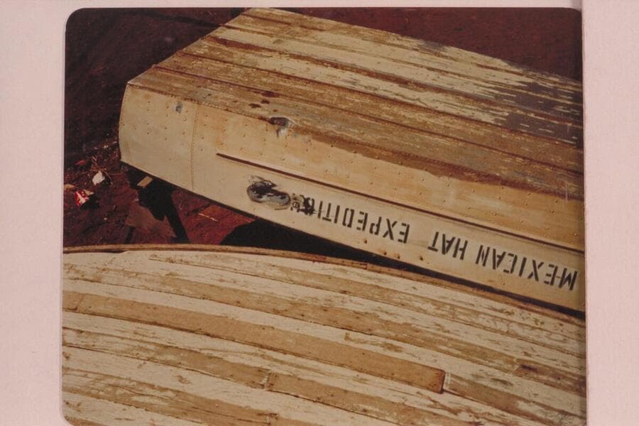 The "Mexican Hat Expedition" aluminum motor boat showing the battering imposed by some rocky navigation. The craft was in Wright's yard at Blanding