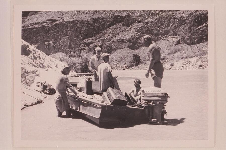 Repairs to baloney below Vulcan Rapid after it had capsized in the big hole