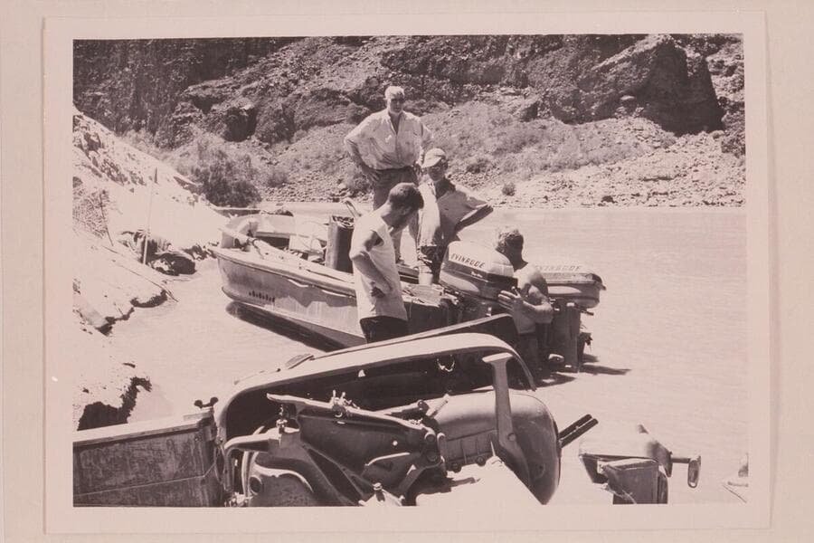 Repairs to baloney below Vulcan Rapid after it had capsized in the big hole