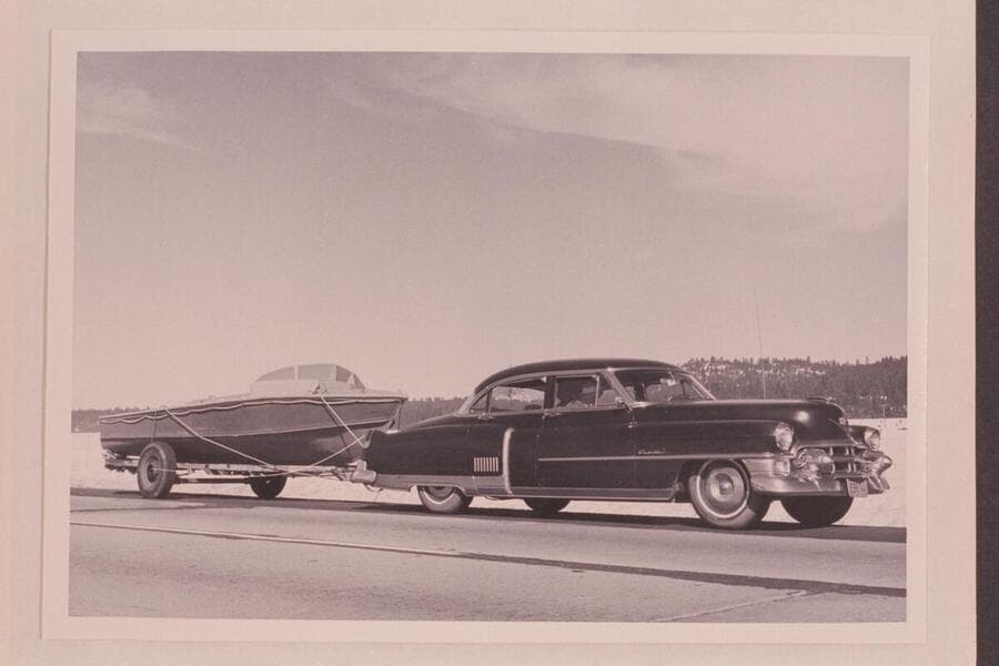 Boat and freight being hauled by ox teams from Flagstaff to Lees Ferry