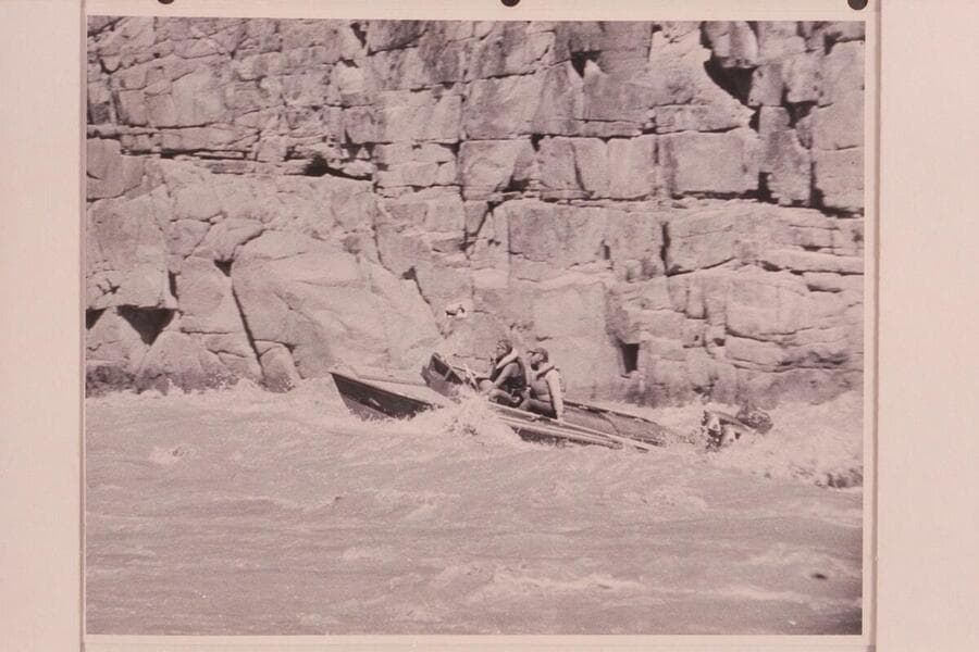 A single motored 18 foot aluminum hull running one of Grand Canyon's rapids. The power unit was 25HP
