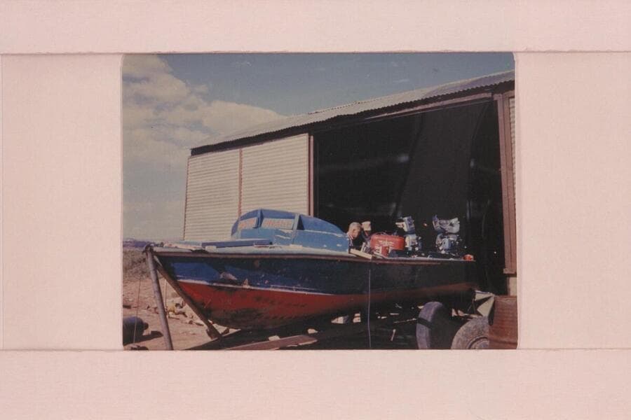 The "CACTUS" in the shop at Fredonia. Ed I'Anson leans on the boat and Rod Sanderson is beyond him