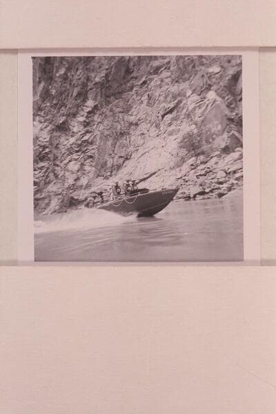 The camera boat at Separation Canyon. Roy Klinger works aft as Gordon Avil watches. Jim Algar studies the script