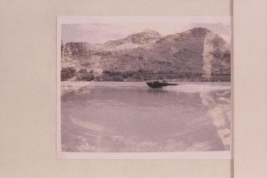 18-ft. Smith-Craft aluminum outboard boat used on Disney Reconnaissance run through Grand Canyon in 1953, June. Lees Ferry