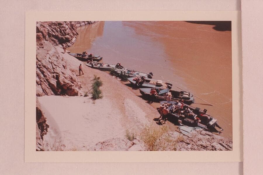 The seven boats of the Marston-Disney fleet moored below the skeleton above Paradise Canyon. Upper left is the "Emma Dean", the "Rattlesnake", the "Cactus", the "Paradox", the camera boat and the "Bootoo"