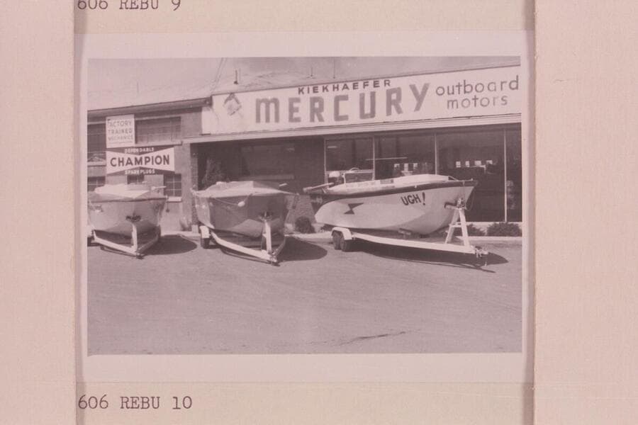 Mercury motors on stern of the "Rapid Eater," one of the 26-ft. boats built for the attempt to run up the Grand Canyon in 1960, June. Salt Lake City
