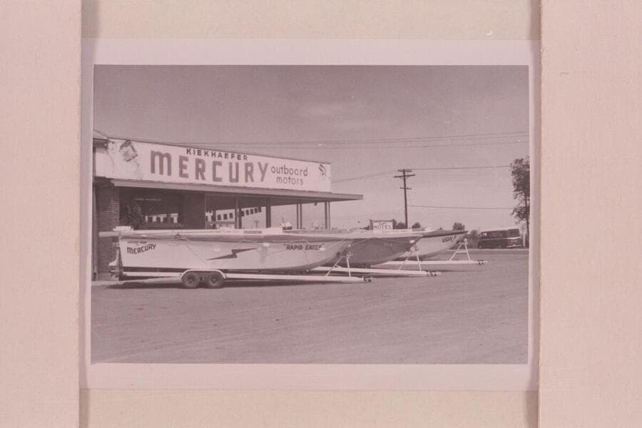 Mercury motors on stern of the "Rapid Eater," one of the 26-ft. boats built for the attempt to run up the Grand Canyon in 1960, June. Salt Lake City
