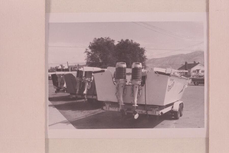 Mercury motors on stern of the "Rapid Eater," one of the 26-ft. boats built for the attempt to run up the Grand Canyon in 1960, June. Salt Lake City