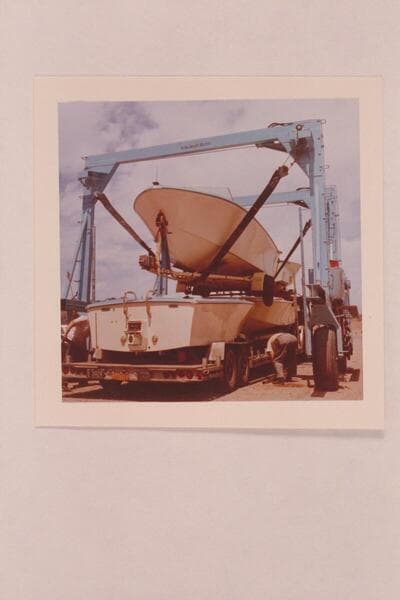 Unloading the 22-ft. Turbocraft in the first shipment to Mack Miller, Colorado River Turbocraft, Box 818, Boulder City, Nevada