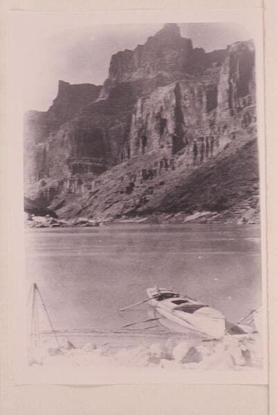 [photo from a stereo] "Views on the Colorado River," Glen Canon Series: Wall of Glen Canon. The "Canonita" is moored at the right bank