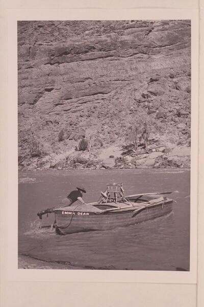 The "Emma Dean" being rolled for attaching a cable. Above Moab and below Castle Creek. Filming of "The Colorado River Story" by Disney