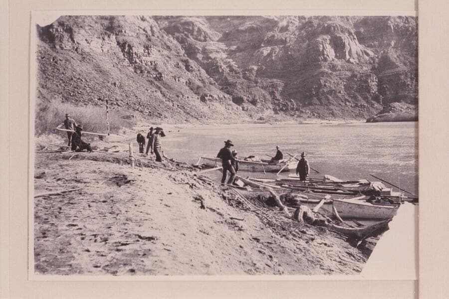 Stanton's boat at Lees Ferry. The far boat has two steering oars. The skiff used by Galloway, Stone and Knox in 1898, Nov., had two oarlocks on the stern