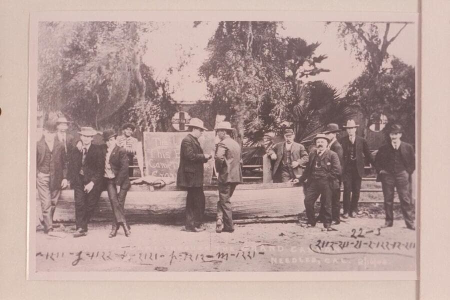 The "Utah" at Needles. Charles Russell stands right center and talking with the man in front of the sign. The sign is the after deck of the skiff