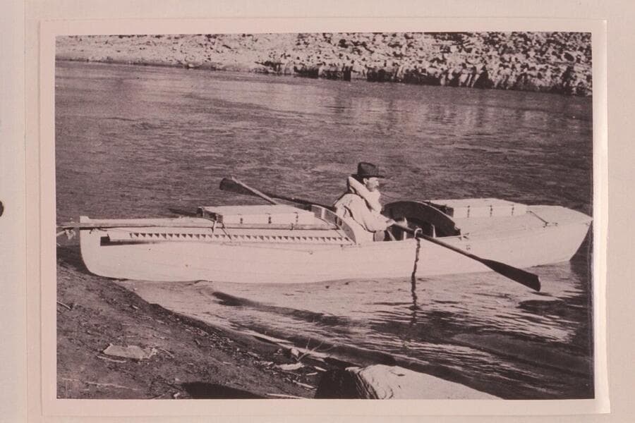 Ellsworth Kolb in boat used by USGS in survey of Cataract Canyon in 1921, Sep. Narrow beam was a handicap to stability. The forward bulkhead is so near the oarsman that he cannot make a full stroke of the oars. In Cataract Canyon