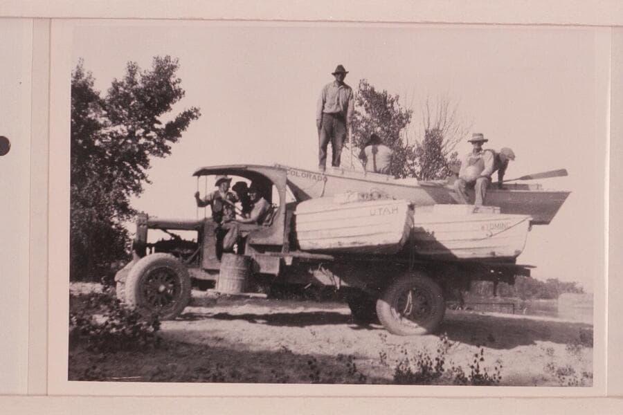The USGS boats being trucked away from river. Greenriver, Utah. Stoner sits with back to camera. Loper sits facing camera