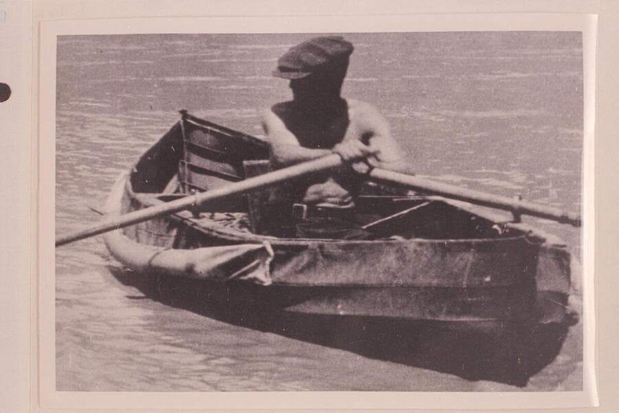 Frank Dodge in the folding canvas boat "Mojave" as the USGS 1923 party left Lees Ferry. The boat was wrecked while lining Cave Springs Rapid