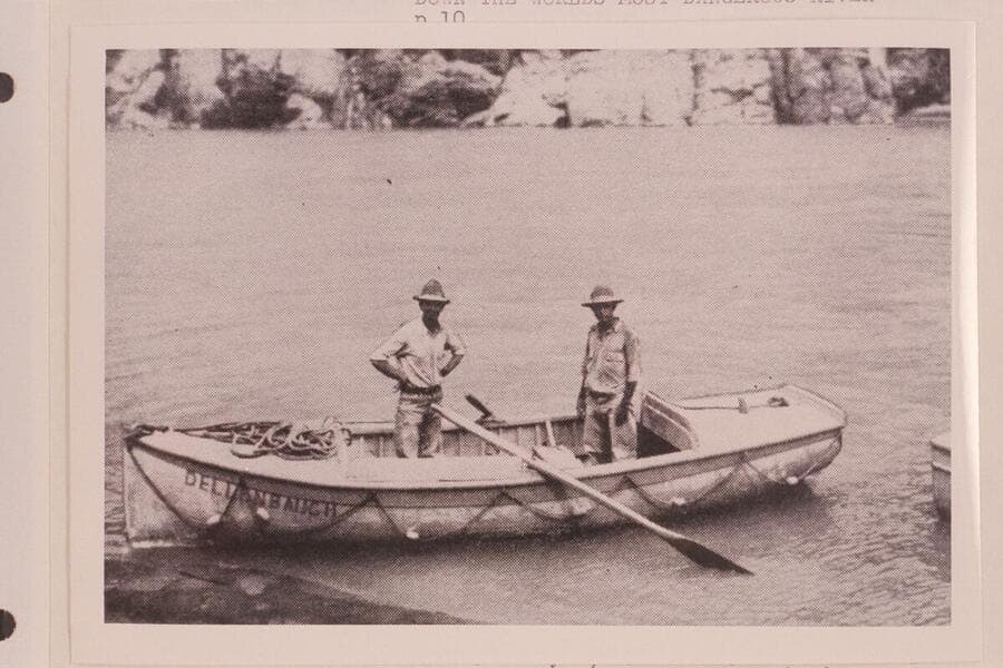 The "Dellenbaugh." One of Clyde Eddy's boats used in the traverse of the Cataract and Grand Canyons in 1927. Galloway and Eddy stand in the boat