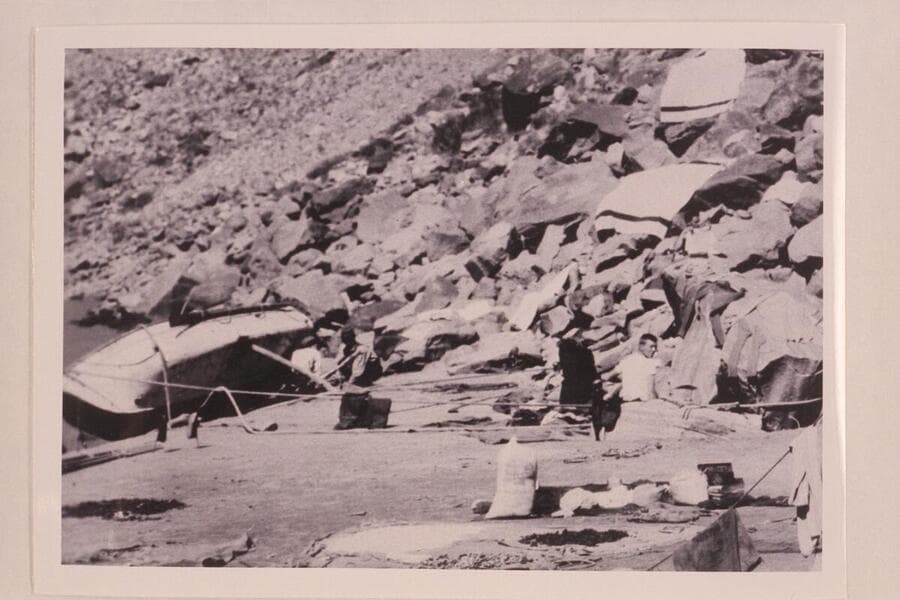 The "Powell," one of Eddy's big boats rolled on shore for repairs after capsizing during lining in Cataract Canyon at the head of the Big Drop