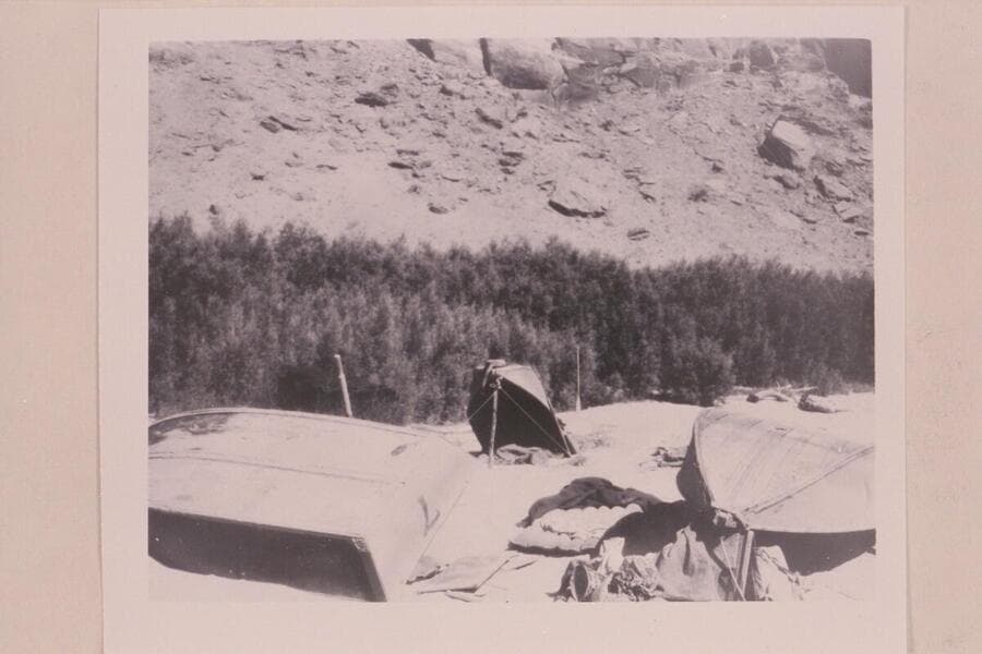 A fold-flat boat in use by the Rainbow Bridge-Monument Valley Expeditions on the San Juan and lower Glen Canyon; 1933-1938