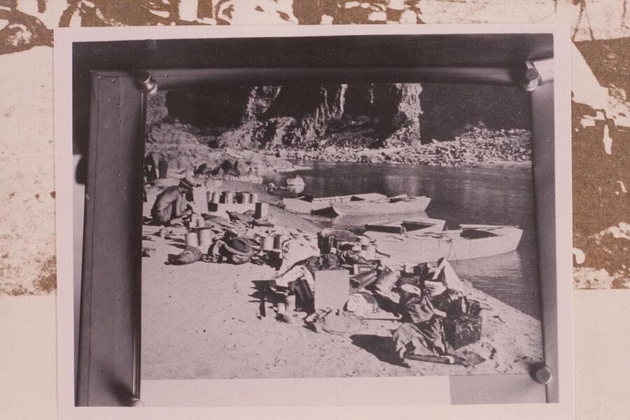 Beauty and Calm--A quiet stretch between rapids. The boat is one of those used during the Swain-Hatch traverse of the Marble and Grand Canyons in 1934