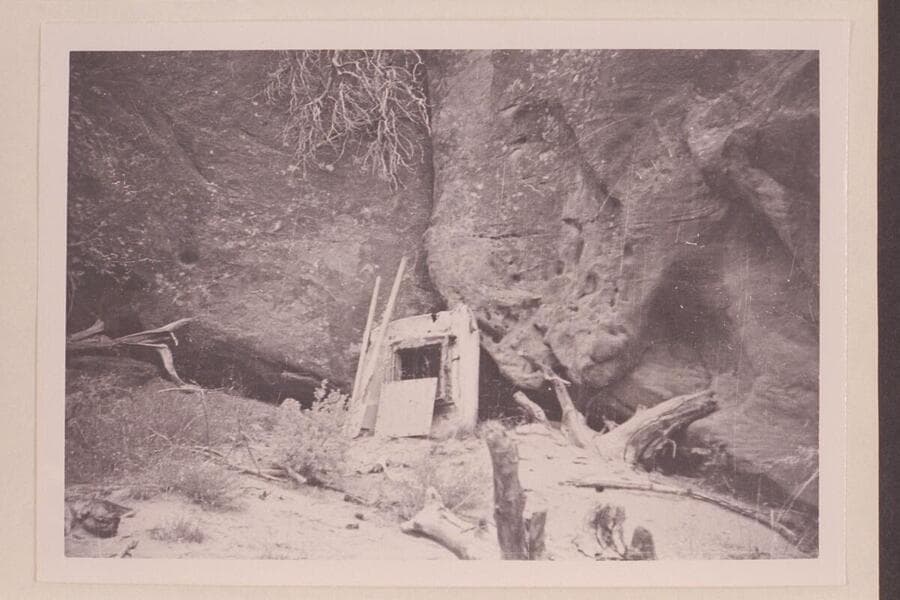 Shirley Morse Marston. Examining the stern section of the "Lota-ve" at the foot of Triplett Falls in the Canyon of Lodore