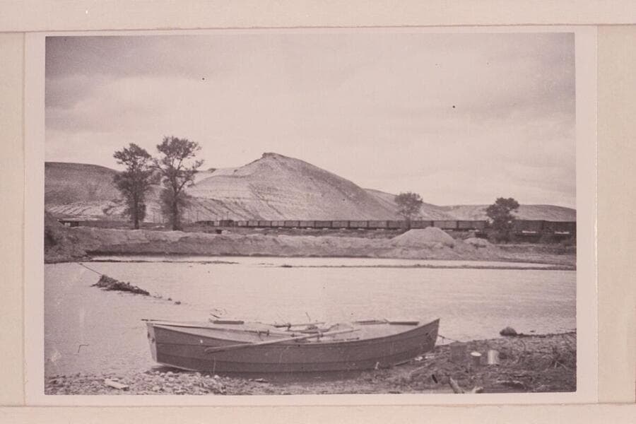 Buzz Holmstrom's boat at Green River, Wyoming below the rail trestle where he started his solo run