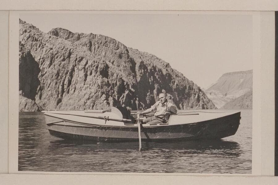 Buzz Holmstrom posing in his skiff the "Julius F", just above Hoover Dam