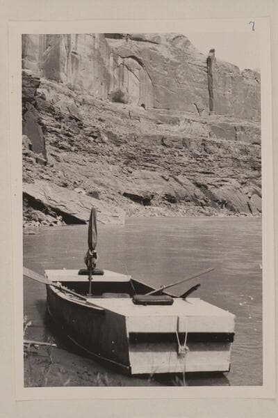 Jack Frost punts for San Juan trip of 1958, June. The painted sign was to facilitate clearing the Glen Canyon Dam site in 1957