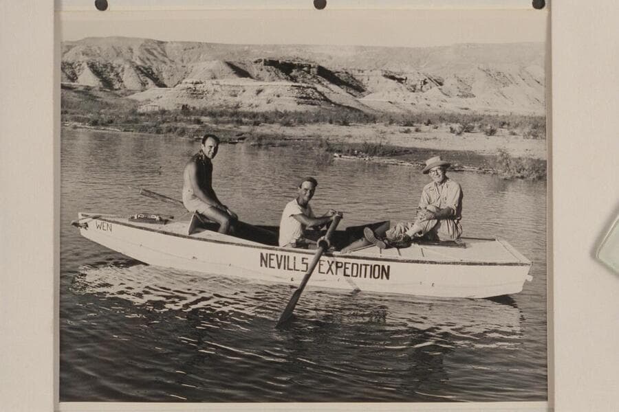 Al Milotte, Norm Nevills and Randall Henderson at Pierces Ferry at end of 1947 traverse of the Grand Canyon