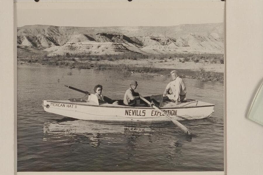 Crew of the "Mexican Hat II" at Pierces Ferry after end of Grand Canyon traverse of 1947. Left to right: Marie Saalfrank, Kent Frost and Joe Desloge