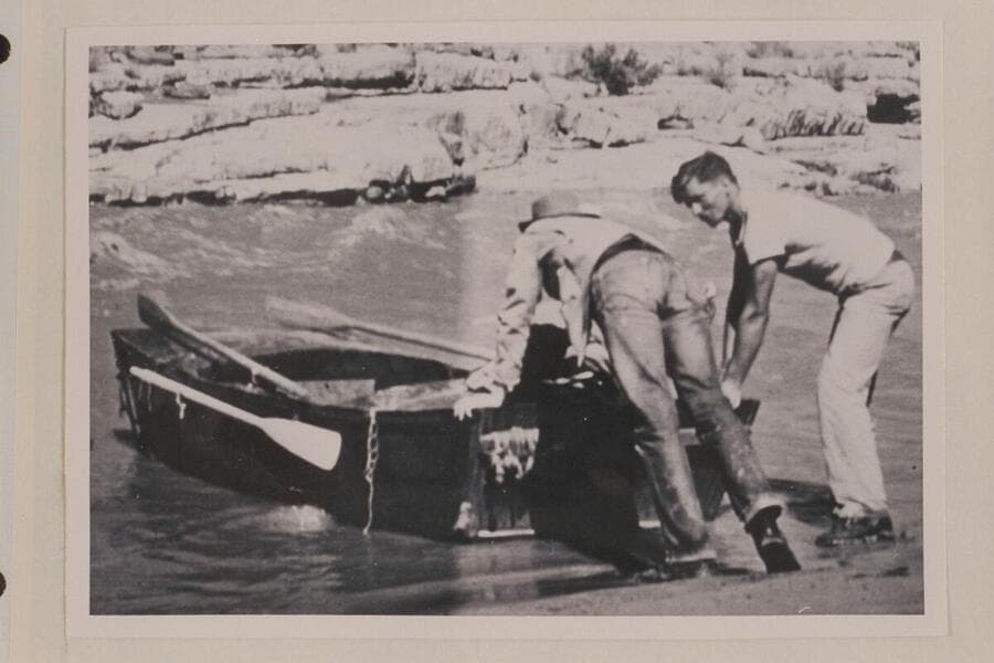 San Juan punts of the Mexican Hat Expeditions at Blanding, Utah. The punt in the foreground has a covering of glass fabric