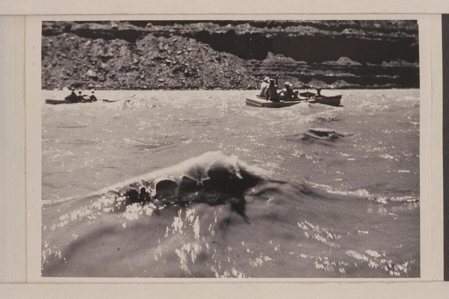 Riding the San Juan below Zahn's Camp. Frost Expedition: John A. Frost, Frank E. Frost and Britton Coll