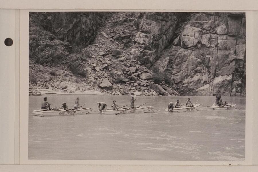 The four Nevills skiff and their passengers at the end of the Nevills' final run of Grand Canyon. L to R: Anspach, Reilly, Kendall, Wright, Anspach, Abbott, Jim Rigg, Joan Nevills, Nevills (standing), Ruth Rigg and Masland