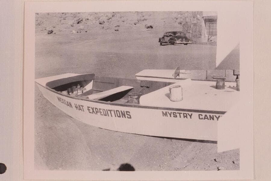 San Juan punts of the Mexican Hat Expeditions at Blanding, Utah. The punt in the foreground has a covering of glass fabric