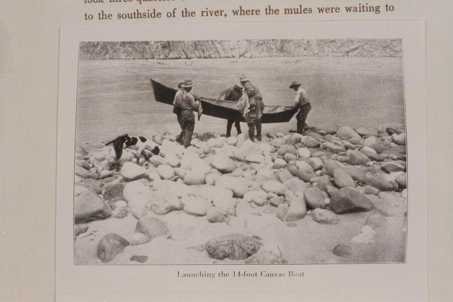 Launching the 14-foot Canvas Boat. The boat was owned and operated by Kolb