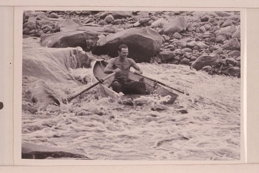 Norm Nevills in 13-Foot Rapid, San Juan River. The flow is less than 400 cfs. The boat is a 10 ft. folding spruce boat owned by Ansel Hall