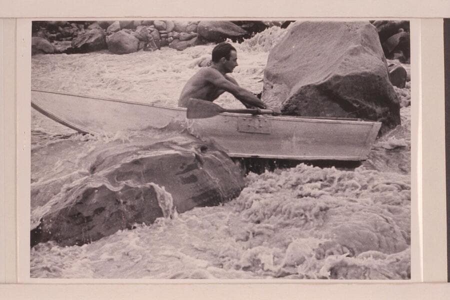 Norm Nevills at 13 Foot Rapid, San Juan River. The boat is one of Ansel Hall's folding spruce skiffs and the river flow is less than 400 cfs