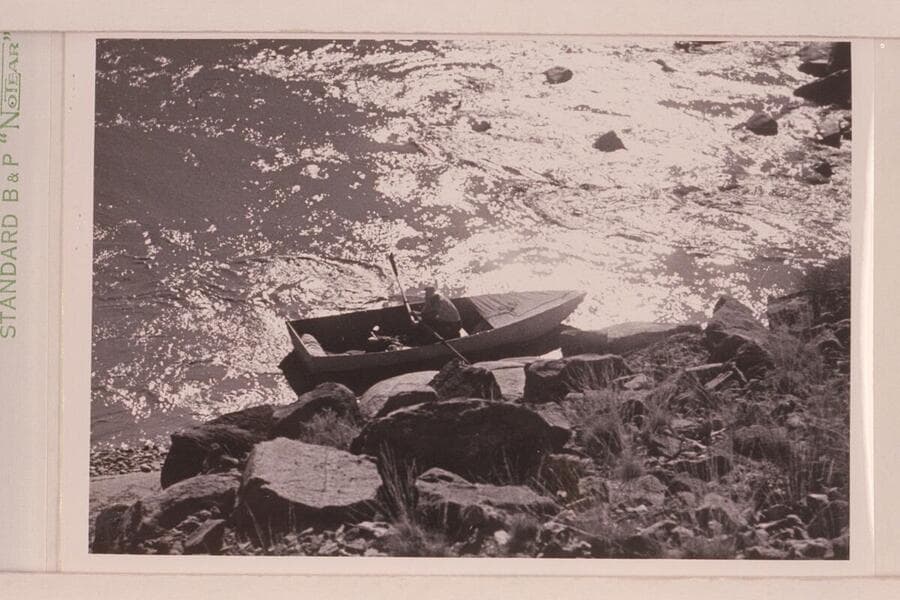 Norm Nevills at 13 Foot Rapid, San Juan River. The boat is one of Ansel Hall's folding spruce skiffs and the river flow is less than 400 cfs