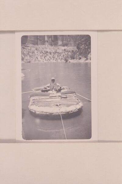 William J. Davis in the neoprene raft used for a run of the Yampa River and upper Green River in 1951, June. 55-lb. raft which weighed 75 lbs. when rigged as shown