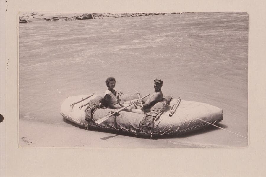 Fern and Bill Davis in 11 1/2-ft. canvas-covered neoprene raft. About 10 min. downriver from Rapid 22, Cataract Canyon