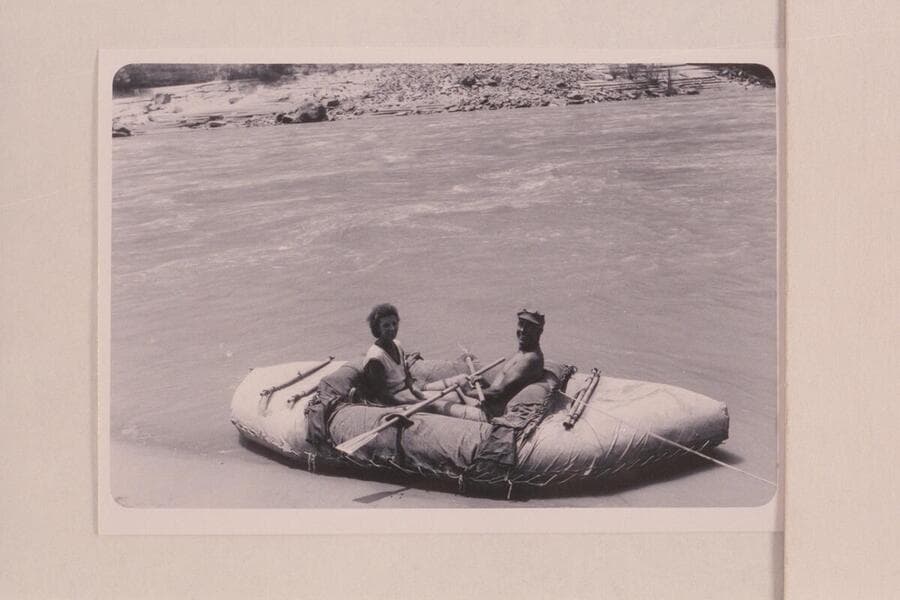 Fern and Bill Davis in their canvas-covered neoprene boat. The inflated craft is 11 1/2 ft. long. Cataract Canyon during run from Flaming Gorge to Bright Angel Creek