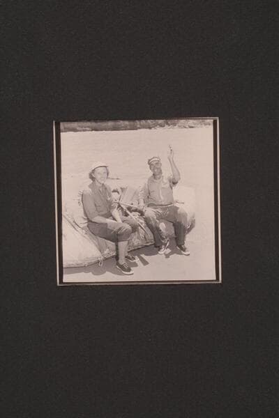 Fern and Bill Davis in the 7-man inflated boat in which they have traveled from Green River, Wyoming, to Bright Angel Creek. At Paria Riffle