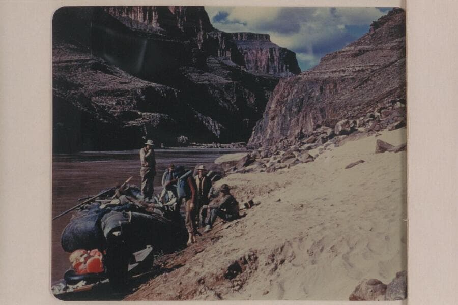 Patching one of the Bus Hatch boloney boats at Phantom Ranch. Bob Bader standing at right